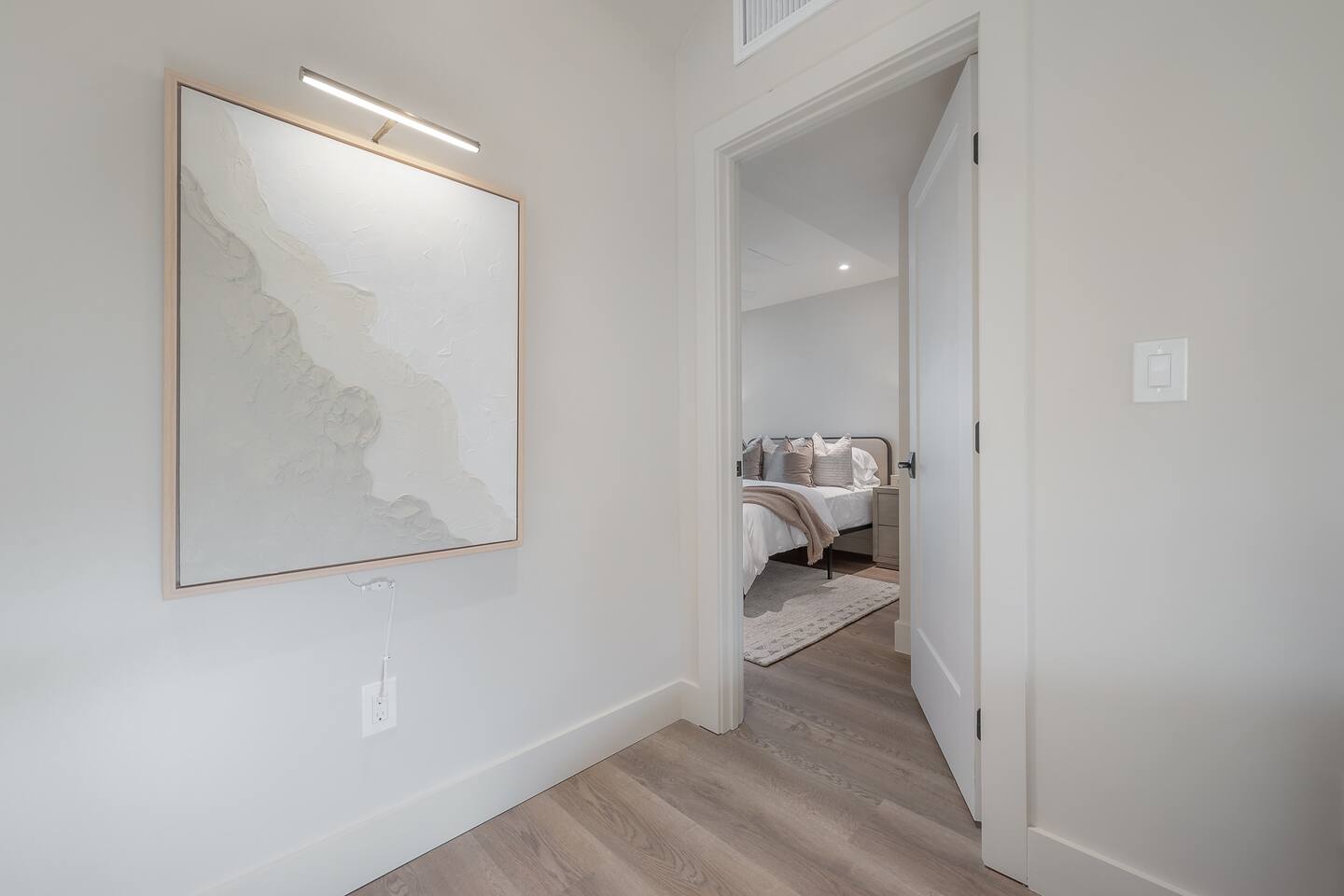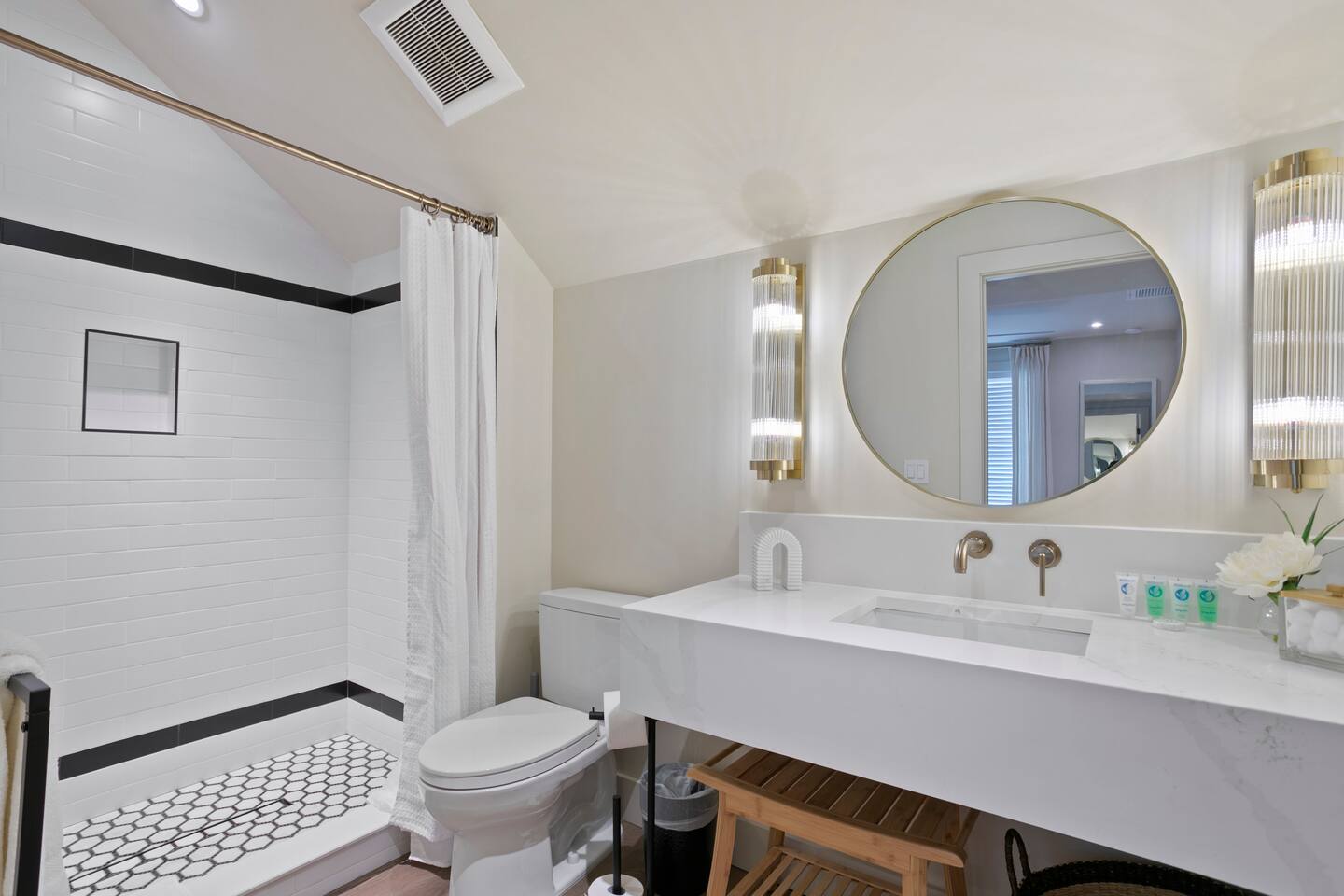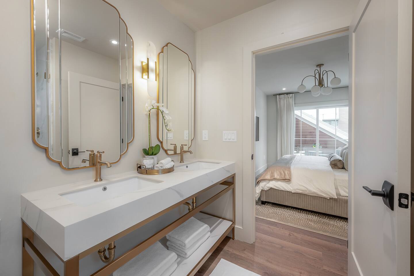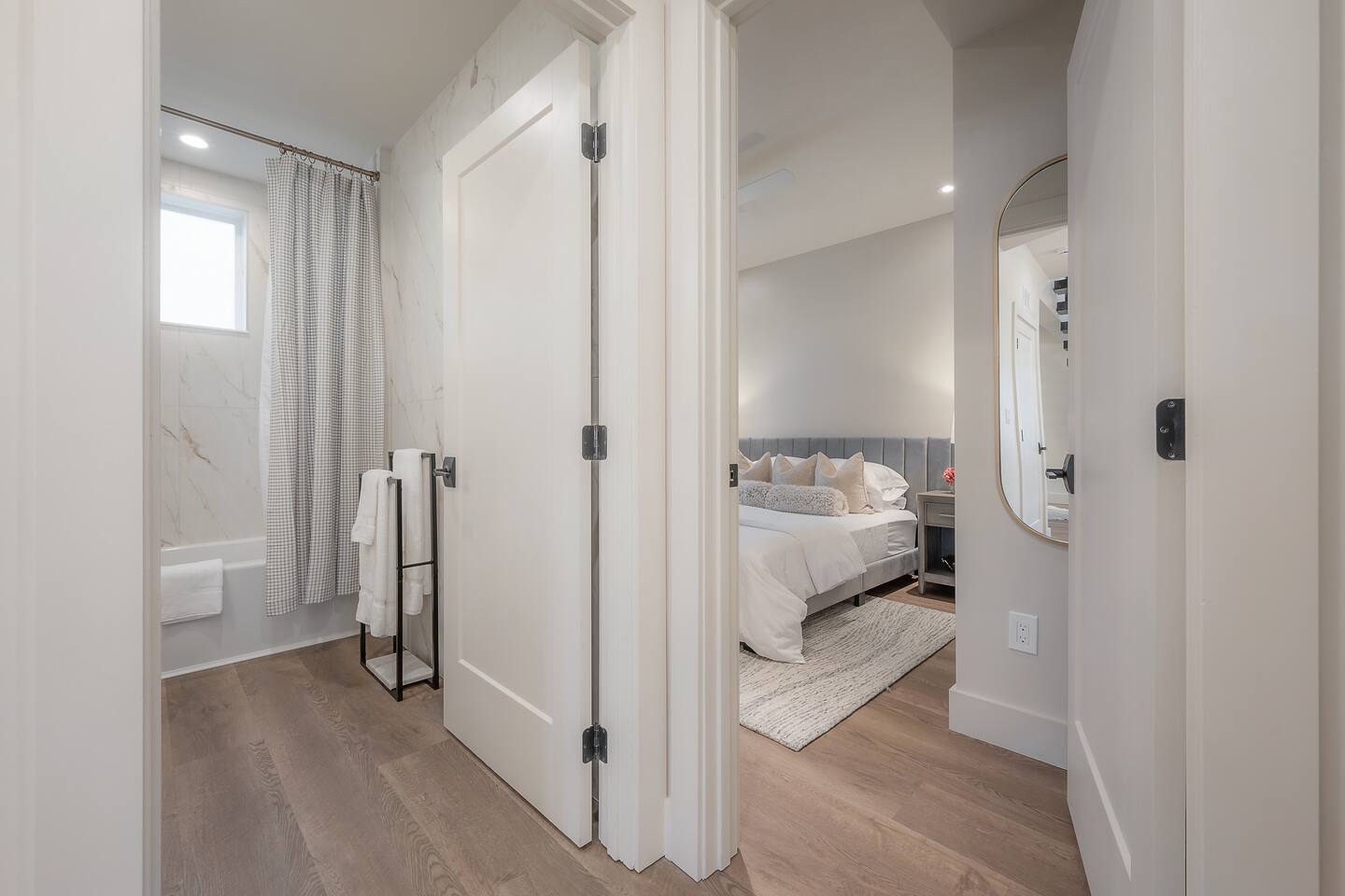 Primary suite - upstairs - king bed - balcony - bathroom with shower Second bedroom suite - upstairs - queen bed - bathroom with shower Third bedroom - downstairs - queen bed- adjacent to separate downstairs bathroom with tub/shower.