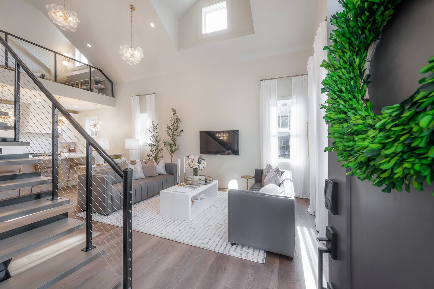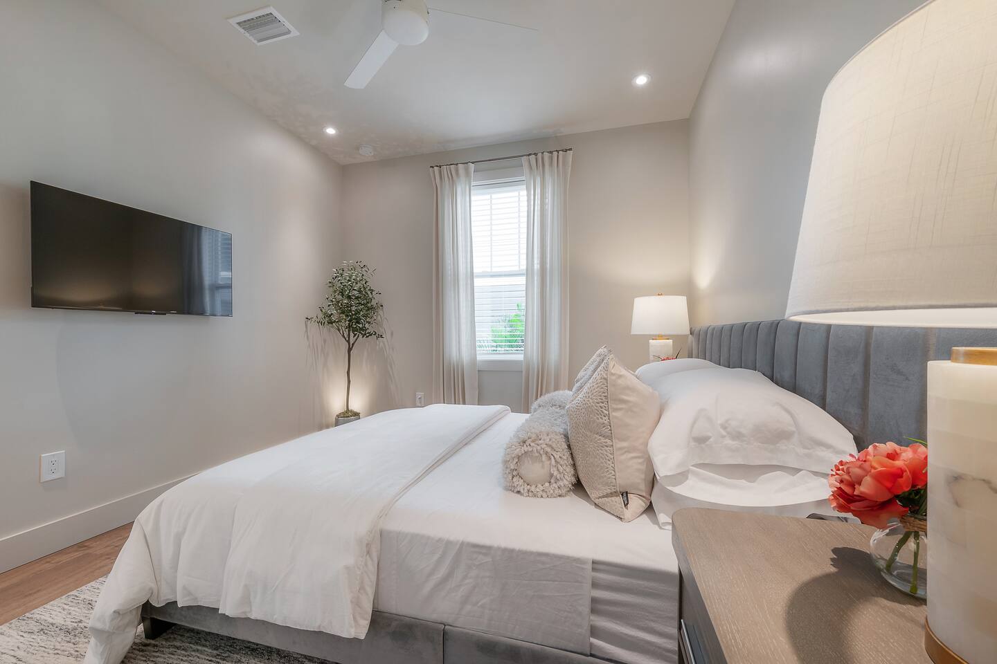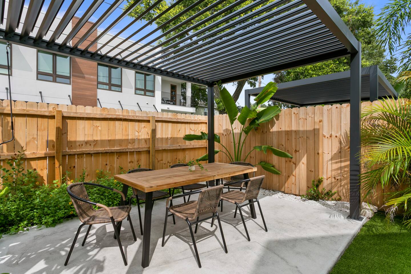 Aster Haus is a gorgeously designed 3-bedroom, 3-bathroom duet (duplex) nestled in the heart of Tampa. This prime location is just steps away from Armature Works and the vibrant Riverwalk. It's also conveniently close to esteemed landmarks like the University of Tampa, Pfizer's innovation hub, the bustling convention center, and downtown Tampa, embodying quintessential urban living. For added convenience, we offer free private parking for two cars. Constructed from the ground up in 2023, Aster Haus exudes timeless bungalow-style charm through its exterior mixed with cutting edge architectural design. This fusion of contemporary convenience and nostalgic aesthetics creates an unparalleled living experience rarely replicated. Upon entering our elegant modern glam space, you'll be greeted by a feeling of airiness, heightened by the striking 25-foot tall ceiling and suspended staircase that adds to the overall grandeur of the living area. The bedrooms have been thoughtfully crafted as cozy sanctuaries for rest, allowing us to optimize the living areas. Our philosophy is straightforward: bedrooms are designed for sleep, while the rest of the house is dedicated to embracing life to its fullest. The primary bedroom boasts a comfortable king-sized bed with Roku TV plus a private balcony for two—a tranquil spot to enjoy your morning coffee while basking in the gentle warmth of the rising sun. The secondary bedroom, equally refined, features a queen-sized bed, an ensuite bath, and a Roku TV for your entertainment. Meanwhile, the downstairs bedroom, adorned with a queen bed and a Roku TV, seamlessly merges entertainment and convenience, thoughtfully located adjacent to the main floor restroom. Our meticulously designed space offers distinct zones for both group interactions and personal retreats. Whether you're savoring morning coffee on the outdoor balcony, unwinding in the tropical oasis of our courtyard, enjoying the intimacy of the glam reading nook, or conversing within the open living space, you'll invariably find the ideal spot to match your mood. The name "Aster" pays homage to the native aster flower gracing our yard alongside nearly 300 other native xeriscaped plants. This vibrant floral ensemble serves as a testament to the natural beauty enveloping our haven. Meanwhile, "Haus," a term steeped in our German heritage, adds a touch of tradition to our modern abode. For those who relish outdoor experiences, our property boasts a covered porch and a pergola courtyard that invite you to embrace authentic Florida living. Enveloped by lush tropical plants and accompanied by the soothing sounds of a water fountain, this oasis provides the perfect setting to unwind and converse. Whether you're immersing yourself in Tampa's vibrant culture, indulging in its culinary delights, or seeking relaxation within a stylish retreat, our luxury listing opens doors to it all. Secure your stay now and transform your Tampa getaway into an indelible memory. **If you're part of a larger group, we also offer three other listings (which, when combined, accommodate a total of 14 guests). These listings are conveniently situated right next to each other. For more details, please refer to our host profile and take a look at the additional listings. Feel free to reach out to us with any inquiries you may have.**